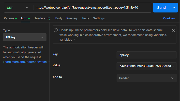 curl --location 'https://wetroo.com/api/v1/?apirequest=sms_record&per_page=3&limit=10' \